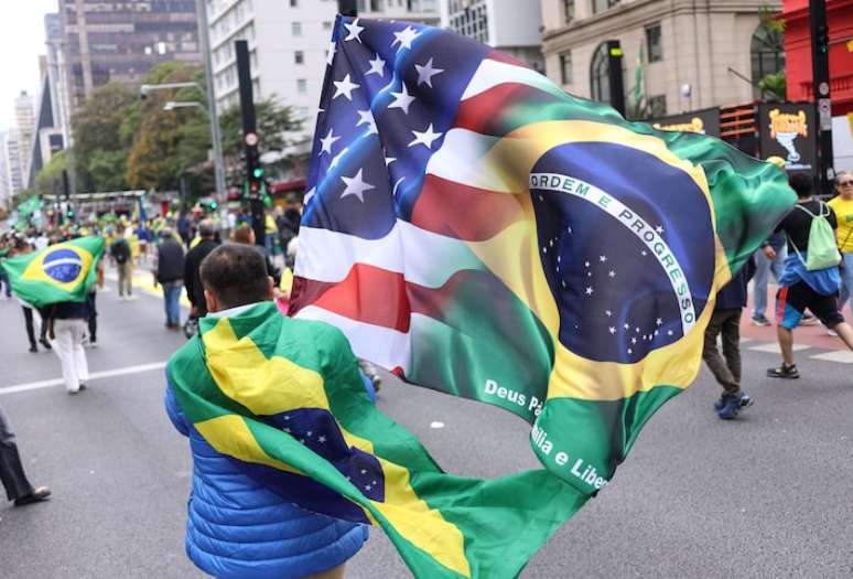 Mas o bolsonarismo foi celebrado por seguidores políticos, incluído o governador de São Paulo, Tarcísio de Freitas. Esse governador é aquele fotografado, recentemente, usando um boné com a inscrição trumpista "make America great again".