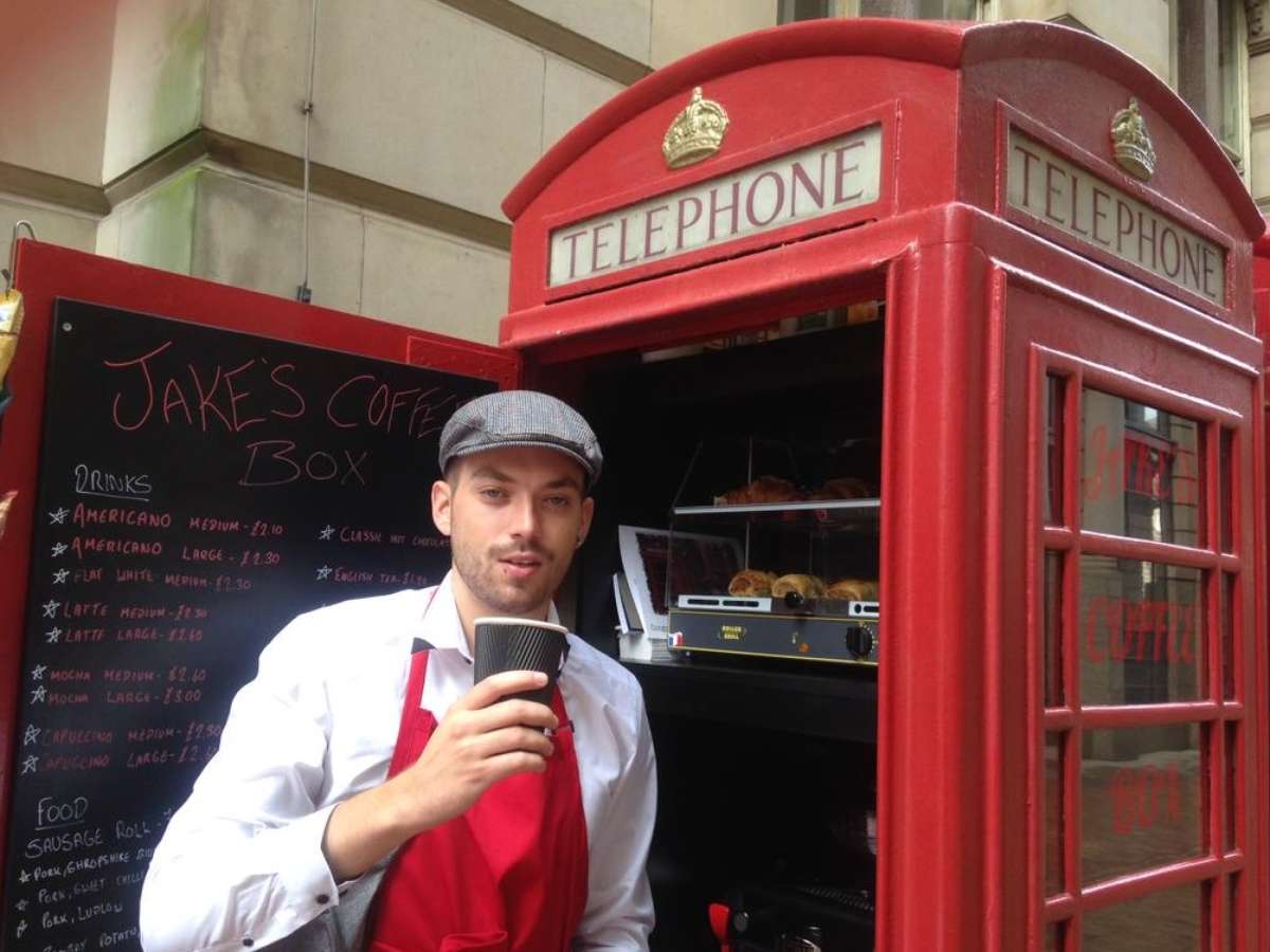 Jake Hollier, de 23 anos, dono da Jake's Coffee Box, é a primeira pessoa a alugar uma dessas cabines em Birmingham.