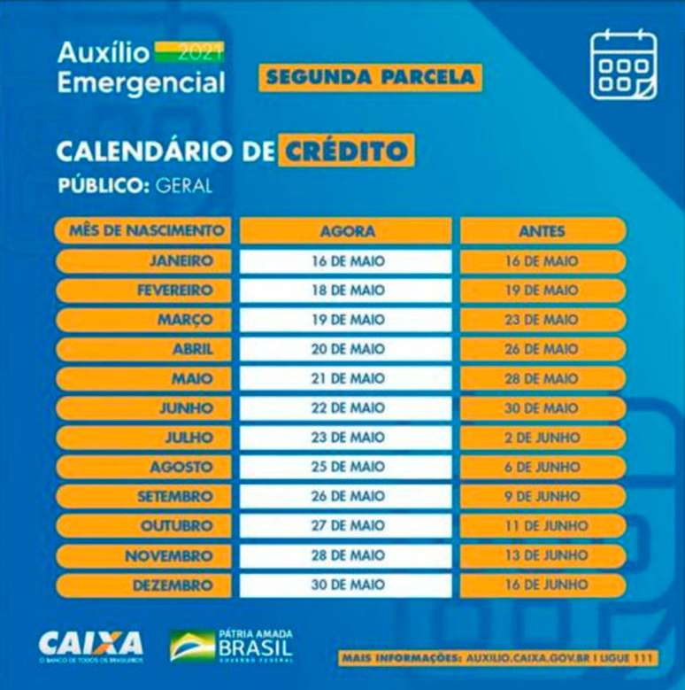 No último dia 13, a Caixa anunciou a antecipação do pagamento da segunda parcela. O calendário de depósitos, que começou no domingo, 16, e terminaria em 16 de junho, teve o fim antecipado para 30 de maio.
