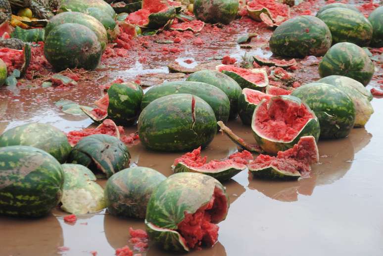 Em todos os corredores, funcionários desinfetavam o chão e as paredes, que ainda tinham manchas de lama. Do lado de fora, as mais diferentes frutas eram descartadas, formando montanhas de melão, melancia, abacaxi e laranja.