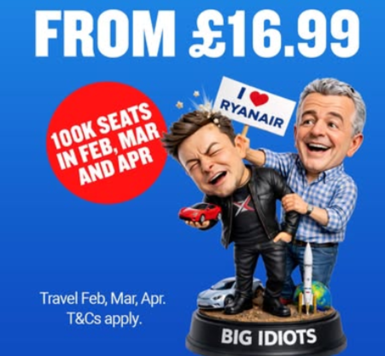 "Talvez Musk precise de um descanso? Ryanair está lançando a promoção Grande Idiotas especialmente para Elon e qualquer outro idiota no X. 100.000 tickets por apenas € 16,99 um trecho. Compre agora antes que Musk pegue um", dizia o anúncio da promoção. O valor da passagem, na conversão para o real, ficou equivalente a R$ 105.