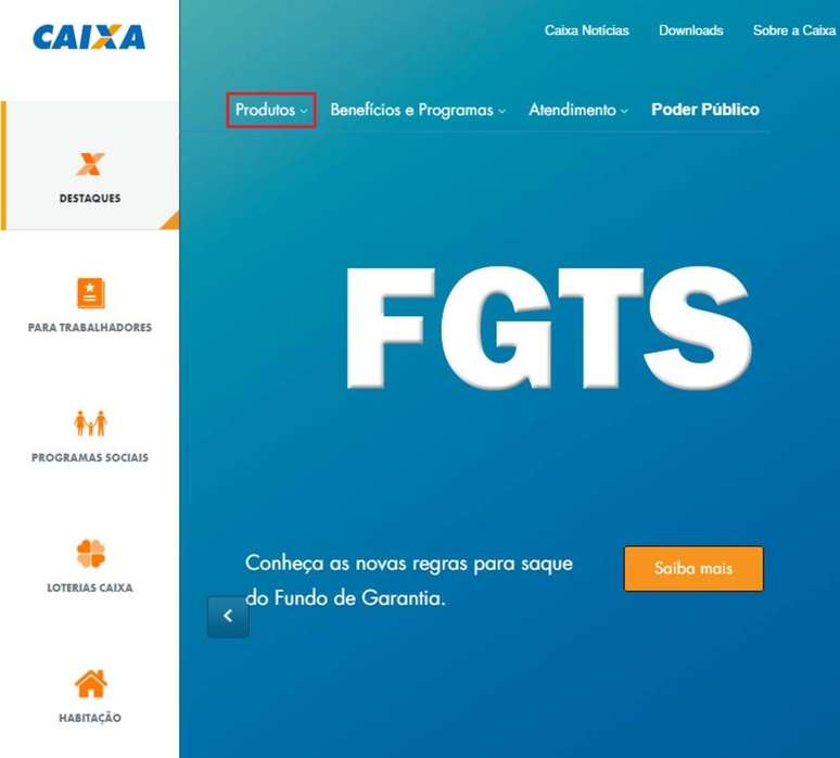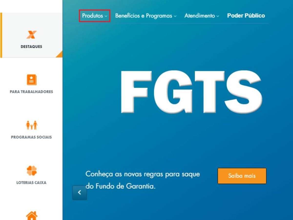 Logo na página inicial da Caixa, há um menu no lado superior esquerdo chamado "Produtos". Clique sobre o link: