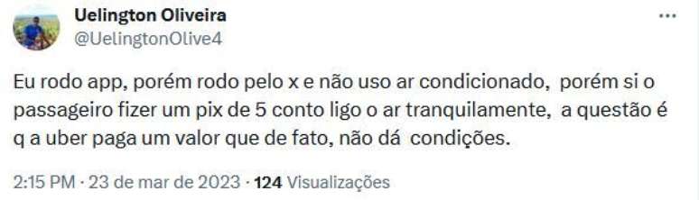 “A Uber paga um valor que, de fato, não dá condições”, explica ele. O caso em questão levanta a discussão: é permitido cobrar pelo uso do ar condicionado?De acordo com o presidente da Associação dos Motoristas de Aplicativo de São Paulo (Amasp), Eduardo Lima, no final do dia, a diferença entre o uso e o não uso do ar-condicionado pode ser de até R$ 20 para o bolso do motorista.
