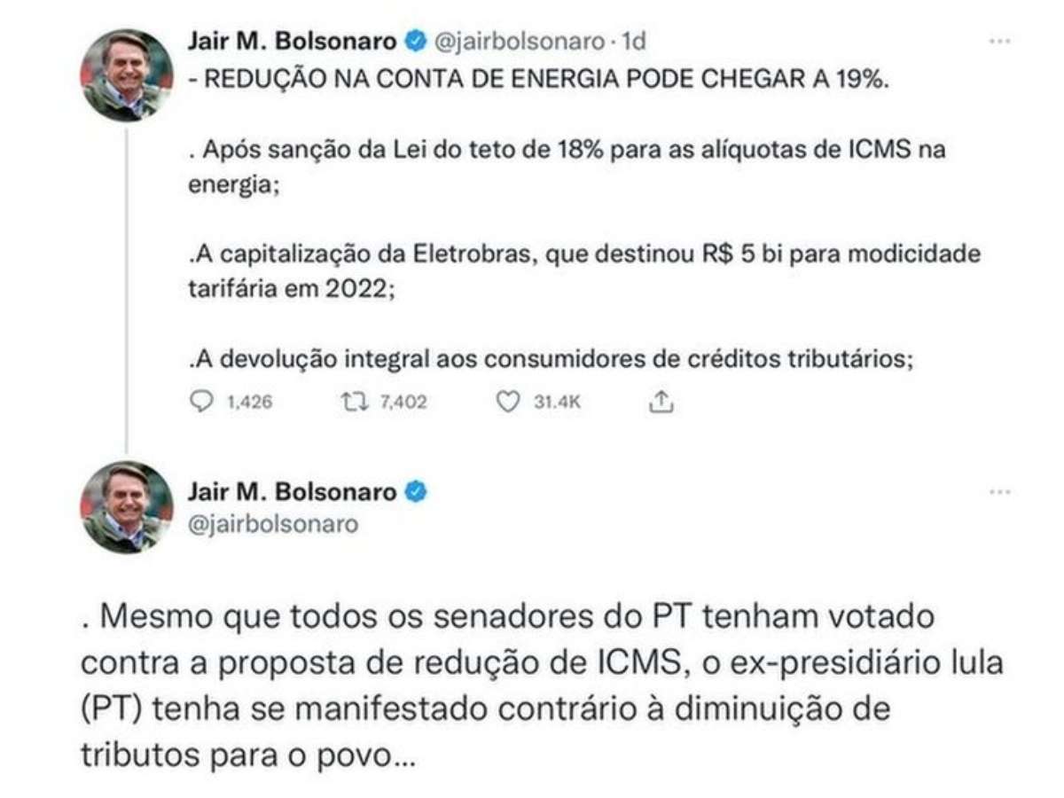 "Mesmo que todos os senadores do PT tenham votado contra a proposta de redução de ICMS, o ex-presidiário Lula (PT) tenha se manifestado contrário à diminuição de tributos para o povo e os governadores, a maioria do Nordeste, tenham acionado o STF para impedir a diminuição dos mesmos, depois da redução no preço dos combustíveis, o Brasil perceberá a mudança agora na conta de luz", prometeu Bolsonaro.