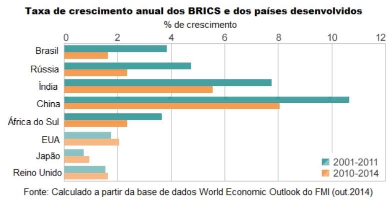 Suas taxas médias de crescimento têm sido inferiores a dos Brics asiáticos o tempo todo e, neste ano, eles desaceleraram ainda mais. Para 2014 como um todo, o FMI projetou crescimento para os dois, mas muito pouco - de 0,3% para o Brasil e 0,2% para a Rússia.