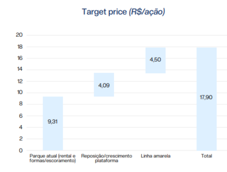 - Mudança e diversificação: A companhia com a entrada de linha amarela e maior atuação em Rental, abre a oportunidade da companhia crescer de forma mais rentável e com maior potencial de oportunidades (inorgânica e orgânica), dependendo menos de formas e escoramentos (chegou a ser 50% da receita e hoje é de 15%).