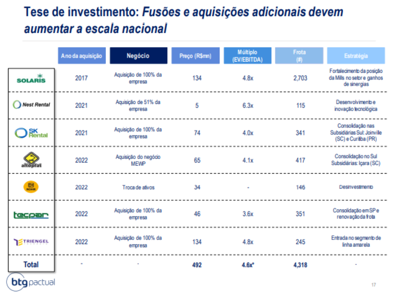Segue abaixo uma tabela feita pelo banco BTG Pactual a respeito das últimas fusões e aquisições da Mills que devem aumentar o seu mercado endereçável de forma significa: