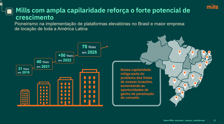 A nova Mills confere uma grande vantagem competitiva devido à sua abrangência nacional, graças a suas 50 filiais espalhadas pelo Brasil, coroando-se o maior player da América Latina, com a segunda maior empresa do setor, com 10 filais. Nas filiais, a Mills poderá dar uma nova vida para as suas máquinas, colocando peças originais e entregando como se fossem novas, prologando a vida útil em 12 a 15 anos, o que melhora drasticamente o fluxo de caixa da companhia.
