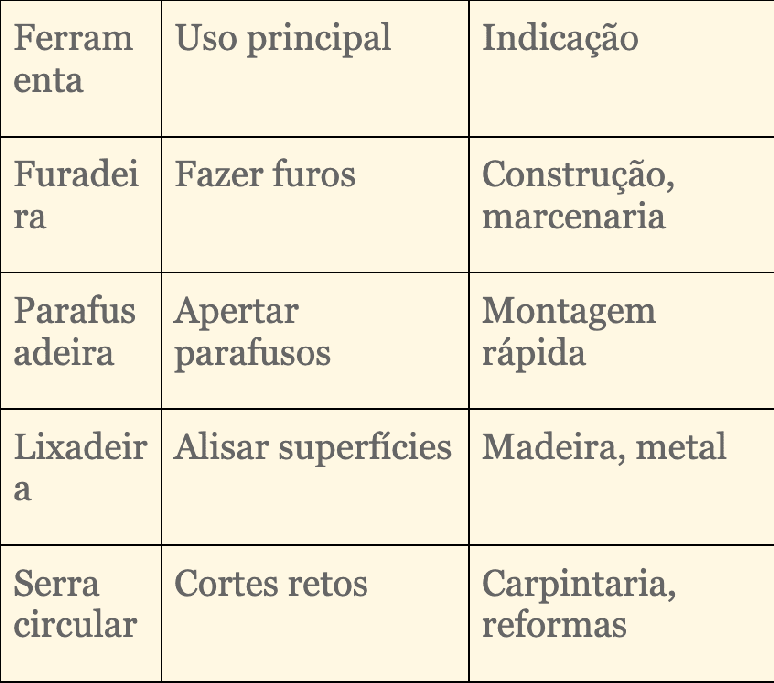 As ferramentas elétricas transformam energia elétrica em movimento, vibração ou rotação. Elas substituem boa parte das ferramentas manuais e garantem melhor acabamento, velocidade e desempenho.