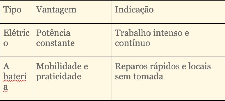 Tem dois tipos principais: as de fio, que não perdem força, e as a bateria, que dão mais liberdade pra trabalhar em qualquer canto.