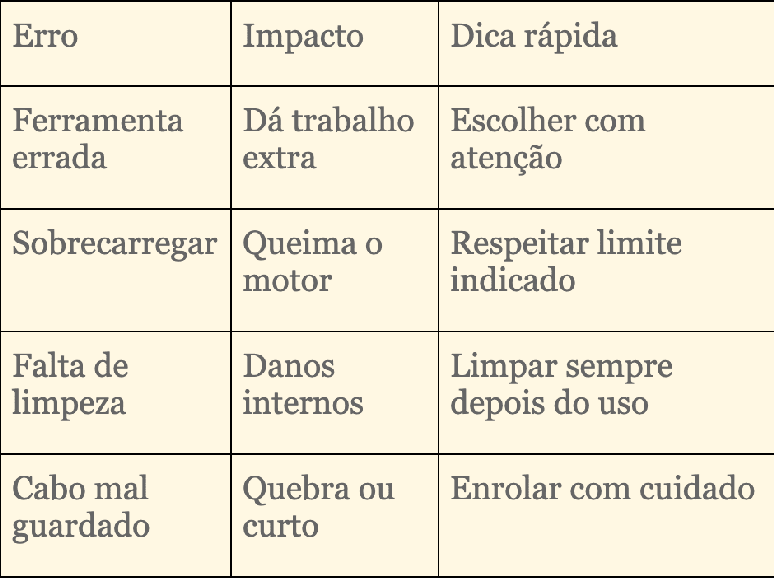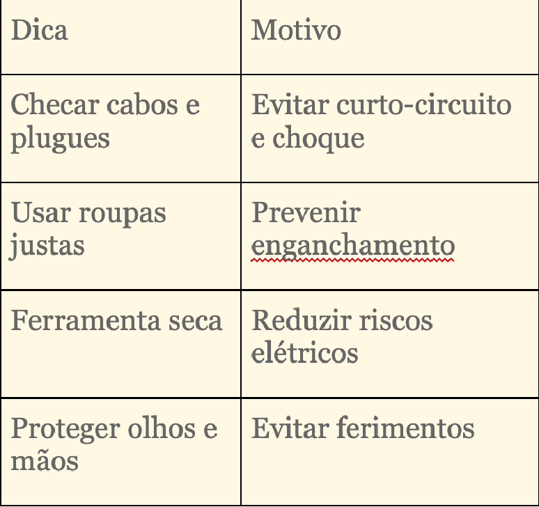 Cuidar das ferramentas, limpar as entradas de ventilação e não usar roupa solta durante o uso ajuda a evitar acidentes. Parece detalhe, mas faz diferença.