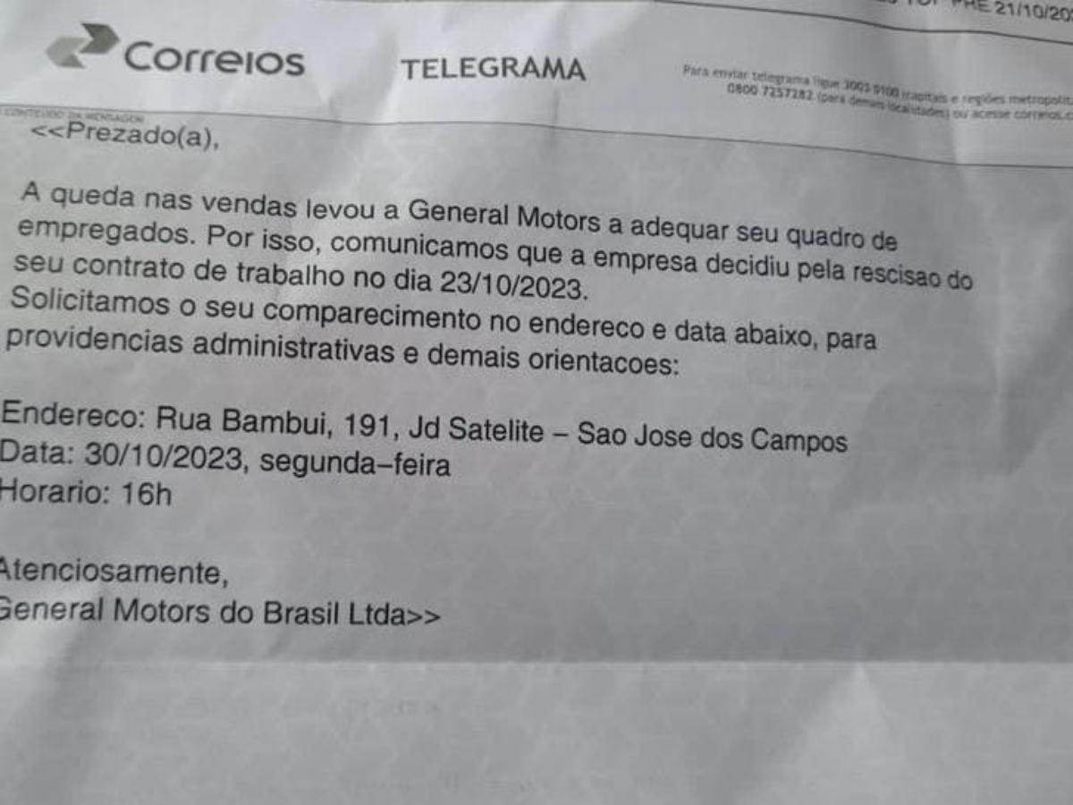 No telegrama, a empresa informou que "a queda nas vendas levou a General Motors a adequar seu quadro de empregados"