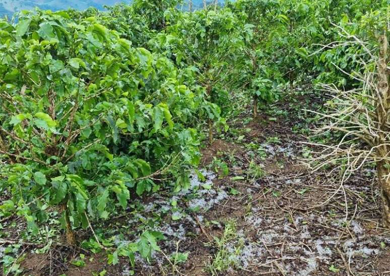 De acordo com o cafeicultor Rodrigo do município mineiro de Lambari, o granizo atingiu várias áreas cafeeiras da região. Em sua propriedade, o granizo atingiu pés de café que estavam em fase de chumbinho partindo para enchimento de grãos.