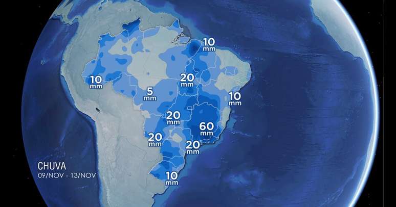 Na quarta-feira (09/11) a chuva segue de Roraima e do Amazonas até o Rio de Janeiro, com previsão de temporais, com raios e rajadas de vento de mais de 70km/h, e acumulados elevados de chuva, em especial, por Tocantins, o Pará, no Amazonas, Roraima e o Maranhão, além de Goiás, leste de Santa Catarina e o nordeste do Rio Grande do Sul.