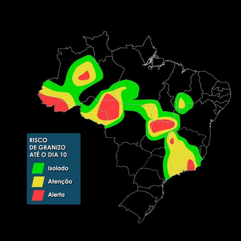 Com destaque para o aumento da precipitação entre Minas Gerais, o Rio de Janeiro e o leste do estado de São Paulo. A probabilidade maior para queda de granizo nesta quarta será sobre MG, RJ, ES, SP, DF, GO, TO, MT, sul do PA e no TO. Veja o mapa: