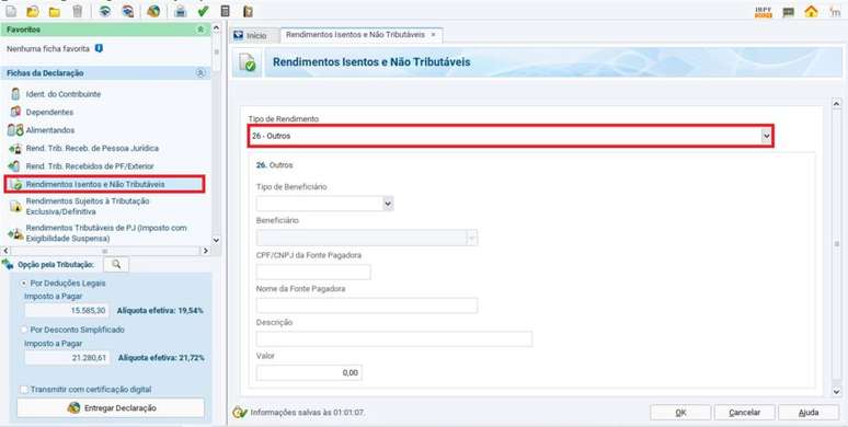 - Caso o contribuinte queira, mesmo assim, declarar o reembolso de uma passagem ou seguro-viagem, ele pode utilizar a opção "Rendimentos Isentos e Não-Tributáveis", localizada no menu esquerdo da declaração, seguido de "Novo" e, no tipo de rendimento, selecionar a opção "Outros".