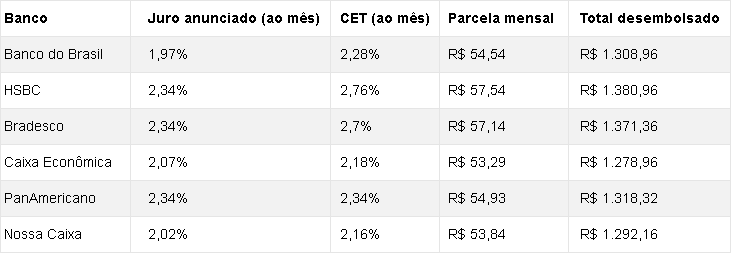 O levantamento compara uma simulação de empréstimo consignado para aposentados do INSS em alguns bancos brasileiros. Além do juro anunciado pelas instituições, também é fornecido o Custo Efetivo Total (CET) do empréstimo, que inclui taxas e impostos cobrados.