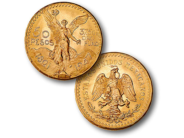 A moeda de 50 pesos mexicana carrega uma águia lutando com uma cobra. A edição comemorativa do centenário da independência é feita de ouro.