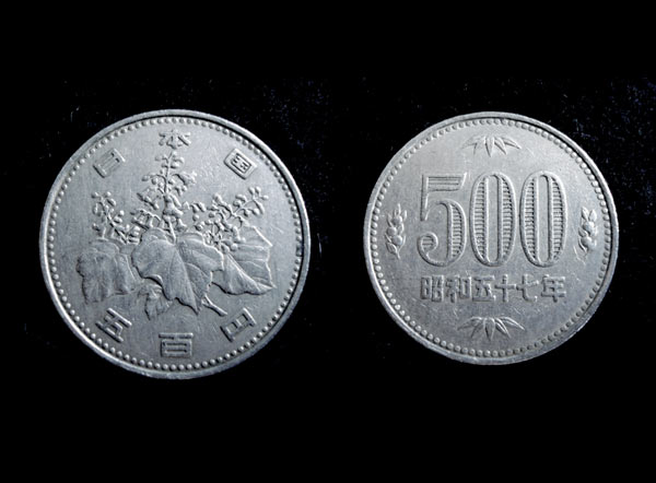 A moeda de 500 ienes tem em uma das faces uma planta Paulownia, que cresce rápido e também é usada para fabricar pranchas de surfe e violões.