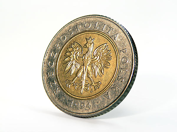 A moeda de cinco zloty carrega a águia símbolo do brasão do país, de bico e coroa de ouro. A primeira tiragem com esta configuração foi feita em 1994.
