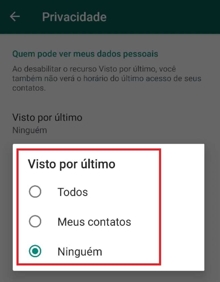 Ao desativar essa opção na sua conta, você também não poderá ver quando os seus contatos visualizaram o app pela última vez.