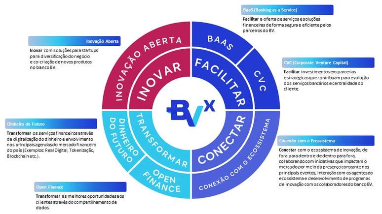 Se valendo deste histórico, o banco decidiu reunir suas iniciativas sob uma bandeira única, o BVx. De acordo com Ricardo Sanfelice, diretor executivo de produtos, clientes e inovação, não se trata de uma nova unidade dentro do banco, mas um guarda-chuva que vai consolidar o que já tem sido feito e o que está por vir. "A gente acredita tanto no ecossistema, mas internamente funcionamos como área. A gora a gente replica esse conceito internamente e reforça nosso compromisso de longo prazo", explica Ricardo.