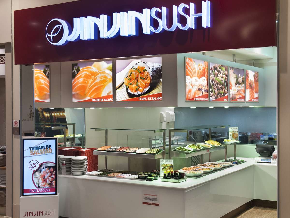 Jin Jin Sushi | com as opções de loja e quiosque, os restaurantes custam R$ 120 mil e R$ 400 mil, respectivamente. A área da loja deve ter no mínimo 10 metros quadrados e 14 funcionários. O prazo de retorno previsto pela franqueadora vai de 18 a 36 meses