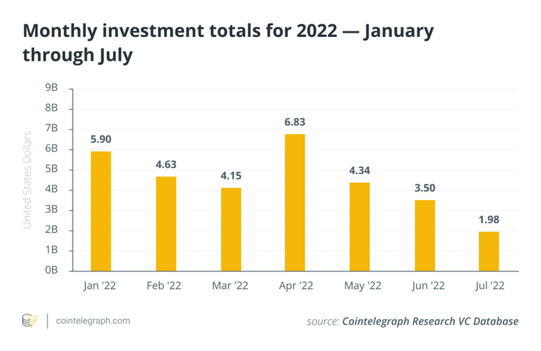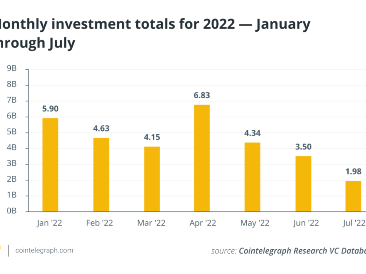 O volume de investimentos para o segmento em julho recuou em 43%, de acordo com os números divulgados pela Cointelegraph Research. O declínio segue um período em que houve uma explosão de interesse de VCs em blockchain, em particular em 2021 e no primeiro semestre deste ano.