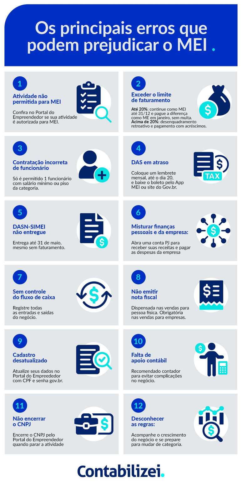 “Também é importante destacar o atraso ou o não pagamento dos tributos mensais por meio do DAS (Documento de Arrecadação do Simples Nacional), o que pode gerar dívidas e prejuízos, inclusive para a pessoa física do titular do MEI”, explica Dias. “Outro equívoco frequente é exercer atividades que não são permitidas ao MEI ou utilizar um código CNAE incompatível com a atuação do negócio ou com o serviço efetivamente prestado.”