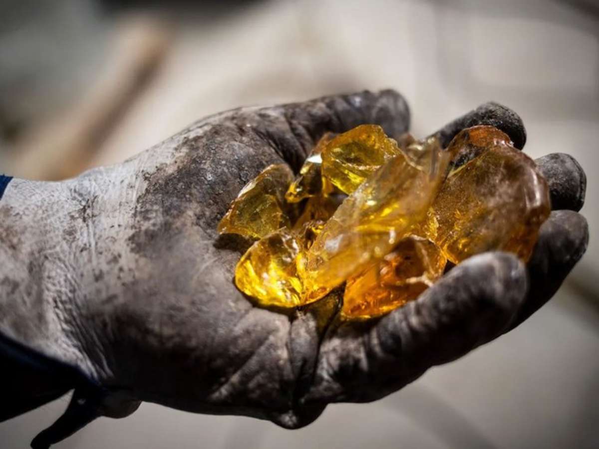 Os produtores enviam a substância para fábricas de destilação, que extraem a terebintina da resina de aparência viscosa e amarelada que solidifica quando resfriada, virando brilhantes pedras âmbar.