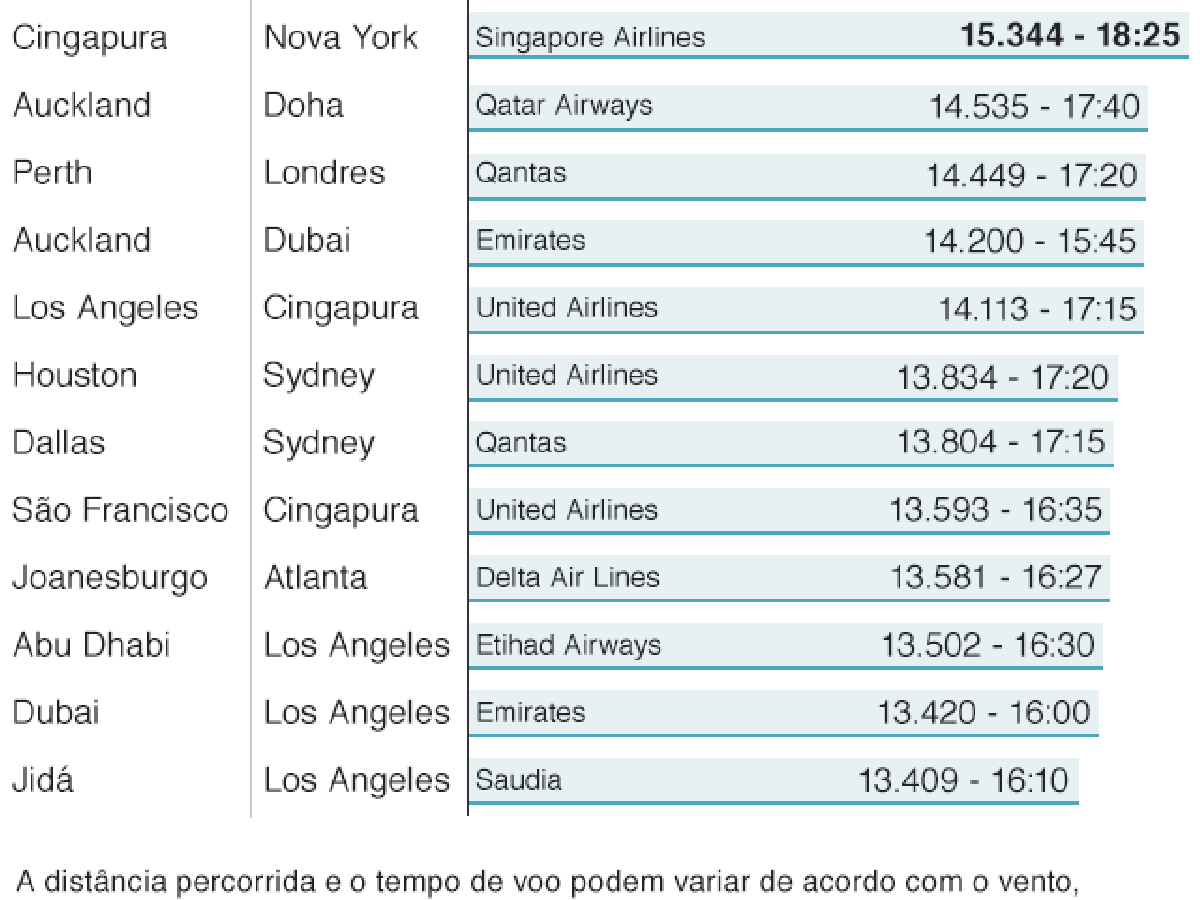 Outra companhia aérea, a Qantas, lançou uma opção sem escalas de 17 horas de Perth, na Austrália, a Londres, no Reino Unido, no início deste ano. Já a Qatar mantém um serviço de 17,5 horas entre Auckland, na Nova Zelândia, e Doha, no Catar.
