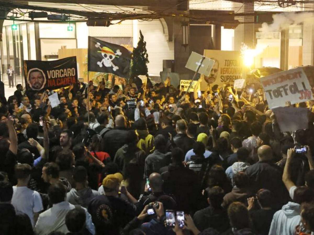Em razão da manifestação, o prédio do Banco Master foi cercado por tapumes, e a fachada com o nome da instituição apareceu coberta por lonas plásticas. No entorno, manifestantes exibiam cartazes pedindo a prisão de Toffoli e do banqueiro Daniel Vorcaro, controlador da instituição financeira, enquanto os organizadores puxavam gritos de "Fora, Dias Toffoli" e "Vorcaro, cadê a delação?", em referência a um possível acordo de colaboração premiada envolvendo o banqueiro.