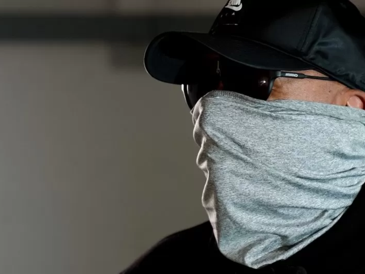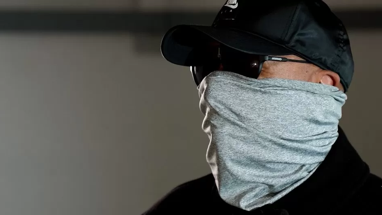 No encontro com a reportagem, em um armazém, seu rosto está coberto por um tecido e por óculos escuros.