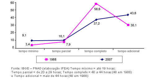 No mesmo período, porém, esvaziou-se a presença de trabalhadores com tempo completo (jornada de 44 horas semanais). Em 1988, 58,6% dos trabalhadores fazia a jornada cheia, ante 37,2% em 2007.