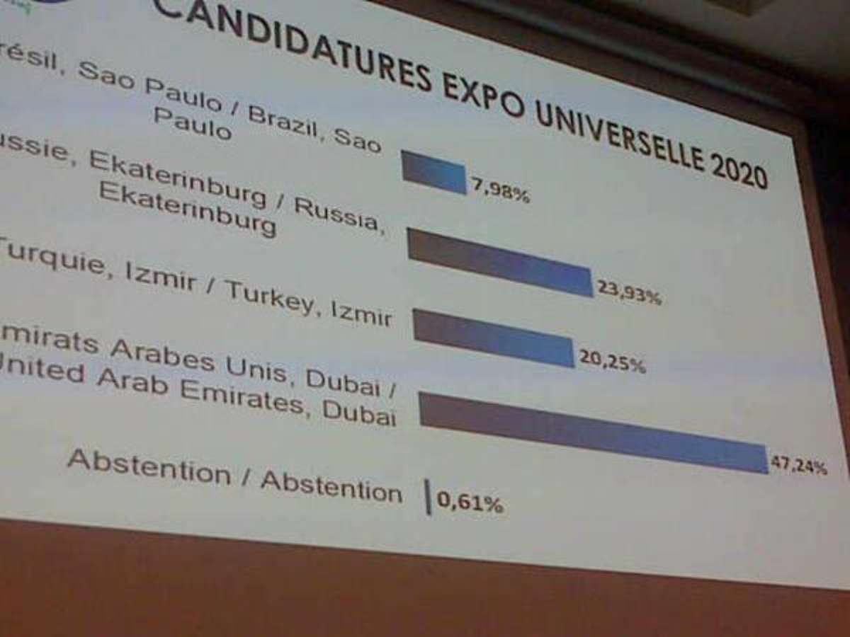A cidade de Ekaterinburg, na Rússia, teve 39 votos e Izmir, na Turquia, 33 votos. “Os países membros do BIE votaram a favor de Dubai para sediar Expo 2020 e será a primeira cidade do Oriente Médio a receber o evento”, disse a organização. Segundo o Birô, a cidade mostrou ter o melhor financiamento para as obras e tem planos ambiciosos para transformar a área do deserto “completamente vago em um oásis”.