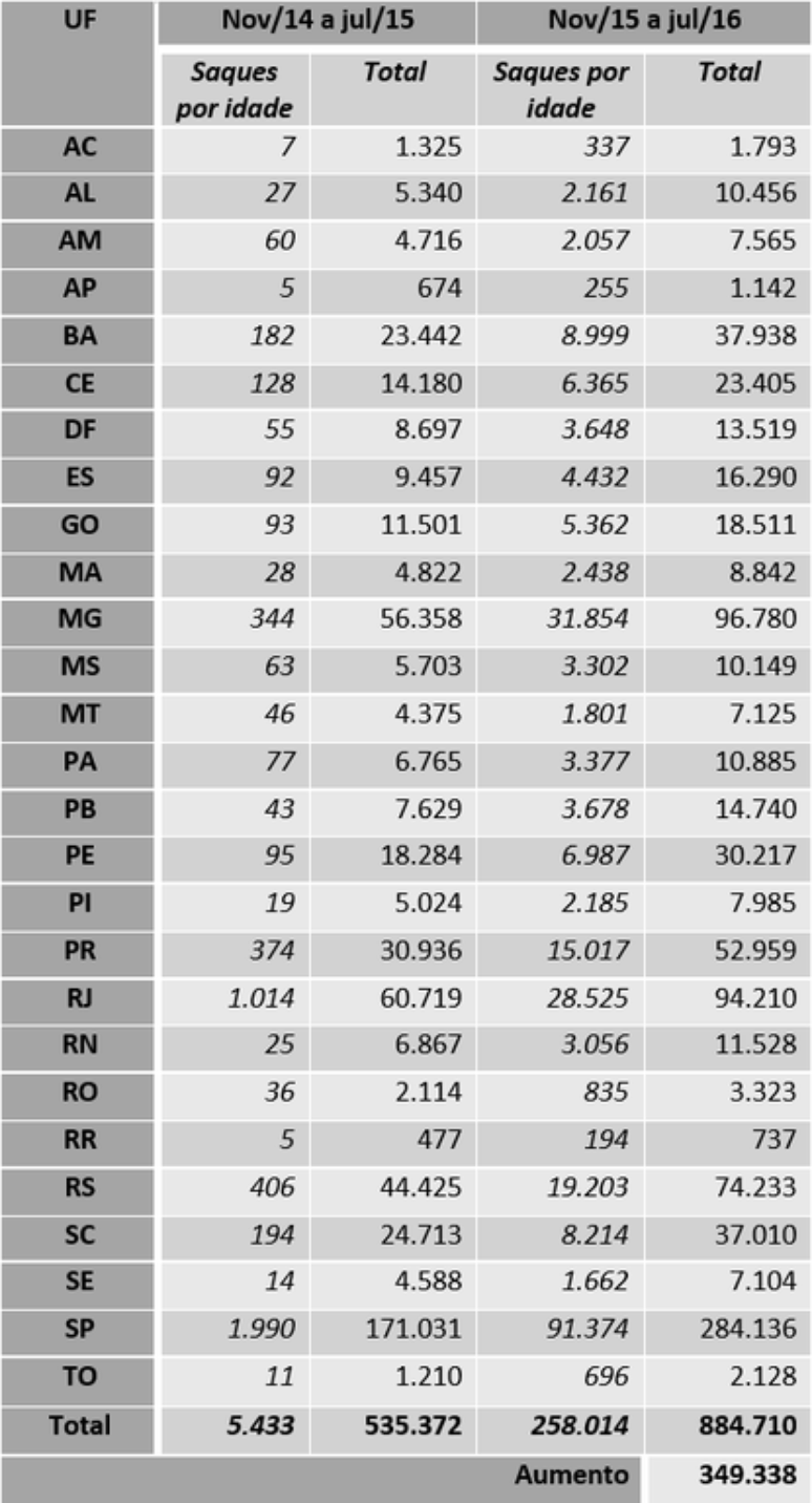 Em 30 de junho de 2016, último fechamento de exercício do fundo, pouco mais de 4,4 milhões de cadastrados tinham direito ao saque por idade, o que representa R$ 7,9 bilhões. O valor do saldo médio por beneficiário é de R$ 2.900,00 no Pasep e R$ 1.500,00 no PIS. Segundo o Tesouro Nacional, o Estado de São Paulo concentrou o maior número de saques (284.136) no período, seguido por Minas Gerais (96.780), Rio de Janeiro (94.210), Rio Grande do Sul (74.233), Paraná (52.959) e Santa Catarina (37.010).