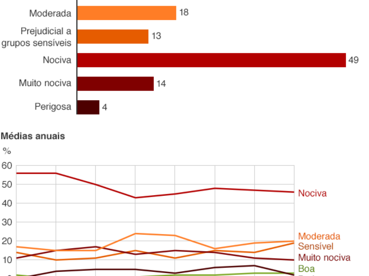 Na embaixada dos Estados Unidos em Pequim, por exemplo, a qualidade do ar atingiu níveis considerados insalubres, muito insalubres ou perigosos segundo os padrões americanos durante a maior parte do tempo – apesar de o número total de dias insalubres ter caído desde 2008, ano em que a embaixada começou a fazer suas próprias medições.