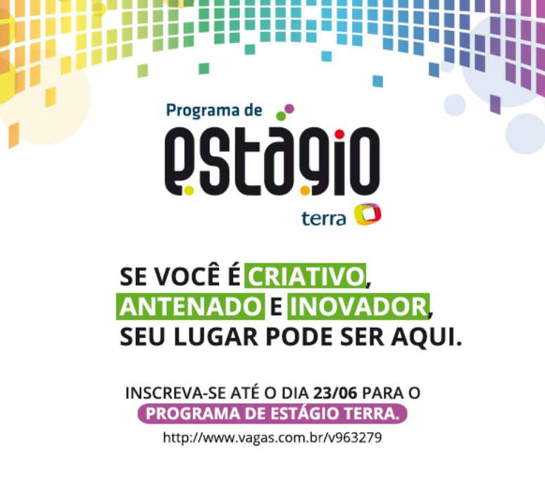 Podem participar do processo seletivo universitários que estejam no penúltimo ou último ano de graduação, com disponibilidade para estagiar seis horas por dia, de segunda a sexta. As inscrições podem ser feitas até o dia 23 de junho, na página do Terra no site Vagas. A duração do estágio é de dois anos.