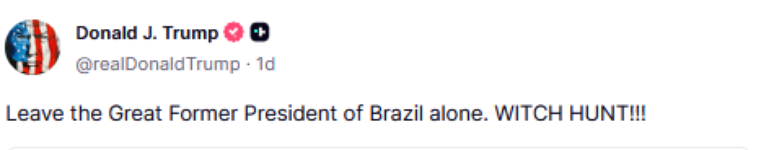 Trump republicou a defesa que fez a Bolsonaro no dia anterior, pedindo novamente que o ex-presidente fosse deixado em paz. Mais uma vez escreveu, em letras maiúsculas: "Caça às bruxas".