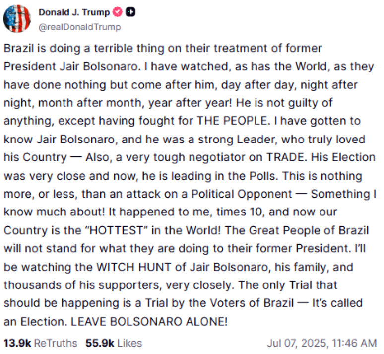 Em publicações na sua rede social, a Truth Social, Trump falou diretamente sobre e ao Brasil algumas vezes -- nas primeiras declarações, tinha como foco o Brics (bloco econômico encabeçado por Brasil, Rússia, Índia, China e África do Sul), e, nas últimas, mencionou especificamente o julgamento do ex-presidente Jair Bolsonaro (PL), alvo de um processo que investiga o planejamento de um golpe de Estado após as eleições de 2022.