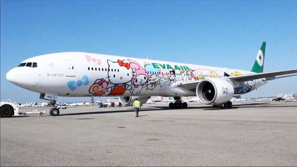 Economia Avião da Hello Kitty agora voa para os EUA Exibir comentários Compartilhar Boeing 777 da EVA Air, que fará rota Taiwan-EUA, chega ao aeroporto de Los Angeles; interior também é todo decorado com o personagem AP Publicidade