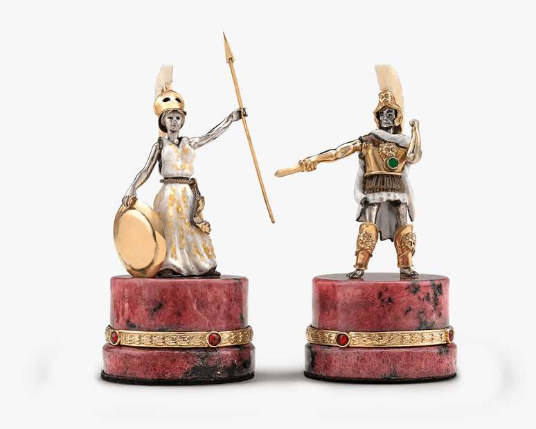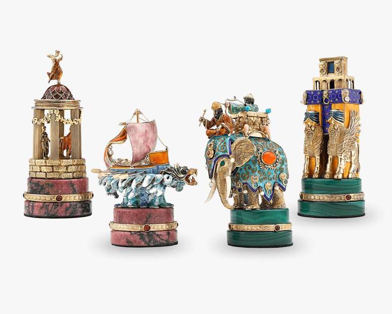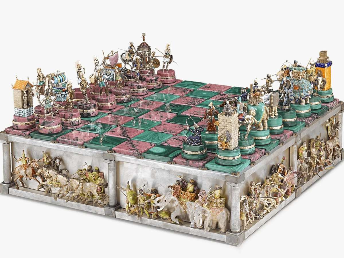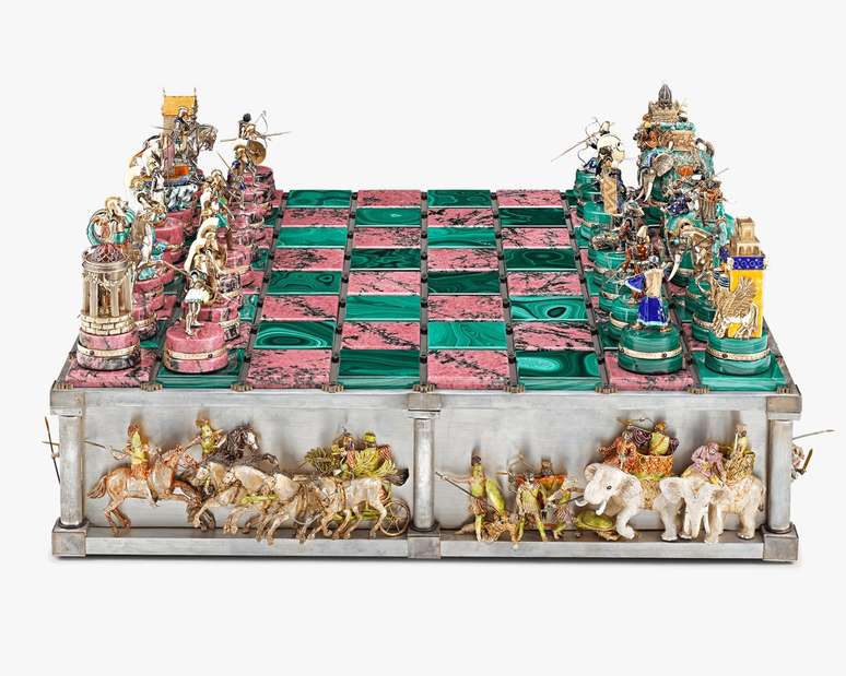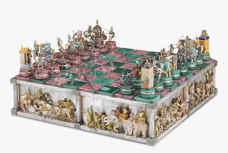 O xadrez de luxo, inspirado na batalha de Alexandre o Grande, é vendido a US$ 1.985.000 (cerca de R$ 9,6 milhões). A obra de Ruven Perelman conta com partes em ouro 14 quilates e pedras semipreciosas, além de movimentos mecânicos.