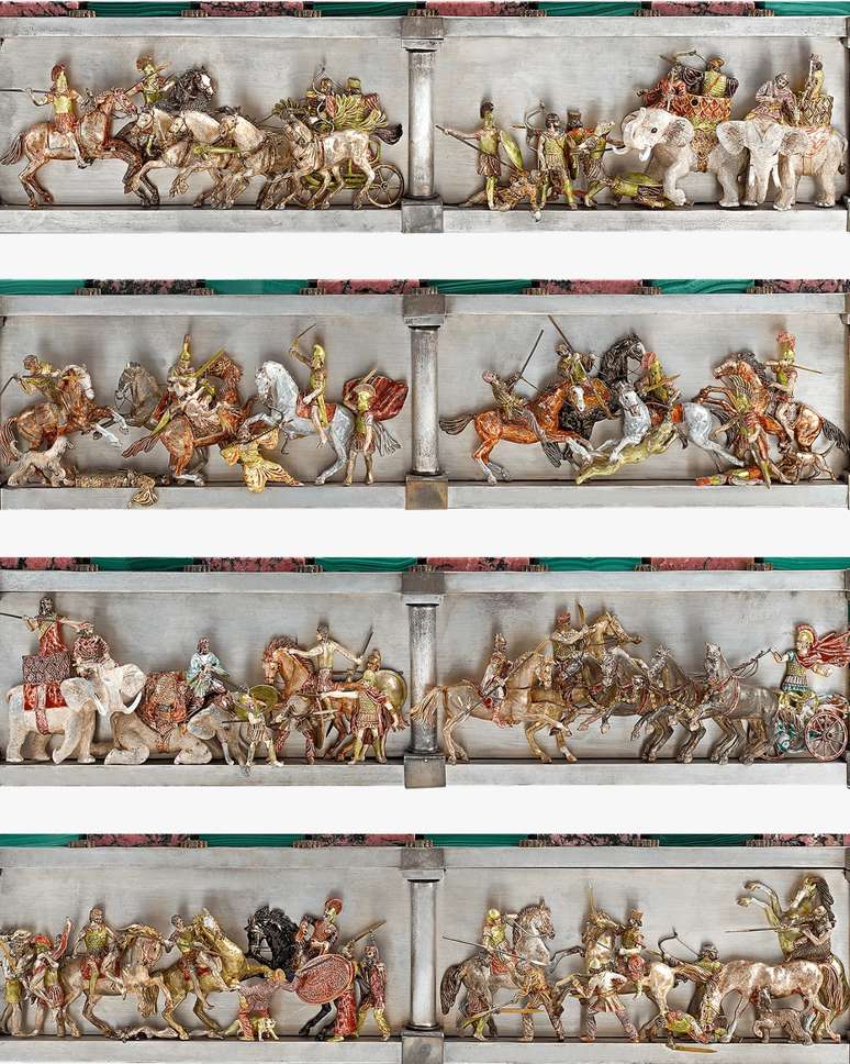 “Nenhum detalhe foi esquecido, desde os cadarços dos soldados. botas até as pequenas flechas emplumadas em suas aljavas. No entanto, mesmo o espetacular design estético das peças é superado pela sua complexidade mecânica. Cada figura assenta sobre uma base sólida de rodonita rosa ou malaquita verde que, ao ser torcida, desencadeia um movimento diferente em cada peça individual”, descreve o antiquário M.S. Rau, de Nova Orleans, nos Estados Unidos, que está vendendo a obra.