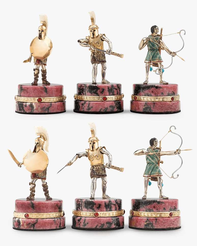Os ‘bispos’ são em formato de navios e as ‘torres’ são como colunas da Grécia e de Persépolis. Os ‘peões’, como era de se esperar, representam soldados.