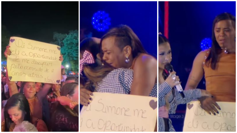 A fã, identificada como Nina, levou um cartaz com um pedido de desculpas. "Simone, me dê a oportunidade de me desculpar pelo ocorrido há oito anos", escreveu.