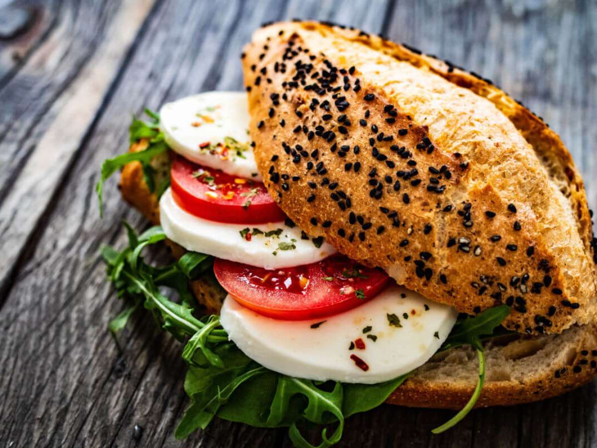 Distribua a rúcula e o manjericão em uma fatia de pão. Em seguida, alterne fatias de muçarela e tomate. Regue com azeite e tempere com sal e pimenta-do-reino. Feche com a outra fatia de pão e sirva.