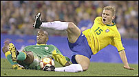 A partida começou num ritmo muito forte, com os dois times procurando o ataque. Aos nove minutos a África do Sul chegou ao primeiro gol. Em cobrança de falta com categoria, Fortune acertou o ângulo esquerdo, sem chances para Helton.