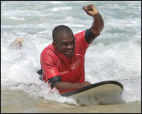 Há duas semanas ele era apenas mais um desconhecido da Guiné Equatorial. Agora era um surfista descolado curtindo com as superestrelas de seu esporte.