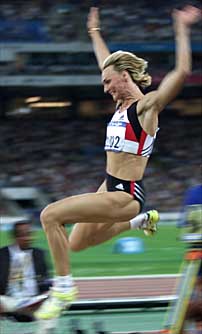 São Paulo – Acabou na manhã desta sexta-feira o sonho da americana Marion Jones em se tornar a atleta com mais medalhas de ouro em uma só Olimpíada. Na final da prova do salto em distância dos Jogos Olímpicos de Sydney, ela teve que se contentar apenas com a medalha de bronze. O ouro foi para a veterana alemã Heike Drechsler (foto), de 35 anos, com salto de 6,99 m. O melhor salto de Jones foi de 6,92 m. A britânica naturalizada italiana Fiona May ficou com a prata