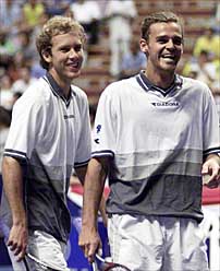 O equilíbrio for marcante no primeiro set. O Brasil esteva mais próximo de quebrar um saque dos rivais, mas todos os tenistas mantiveram os serviços e o jogo acabou para o tie-break. Logo na sua primeira vez de sacar, Guga cometeu uma dupla falta. A dupla rival abriu vantagem de 4 a 2. Porém, os brasileiros reagiram e chegaram ao empate. Ainda tiveram uma chance de definir o set em 6-5. Só que, na hora da decisão, Oncins acabou cometendo uma dupla falta e a parceria Albano/Arnold levou a melhor.